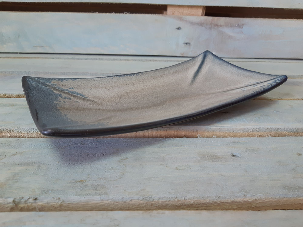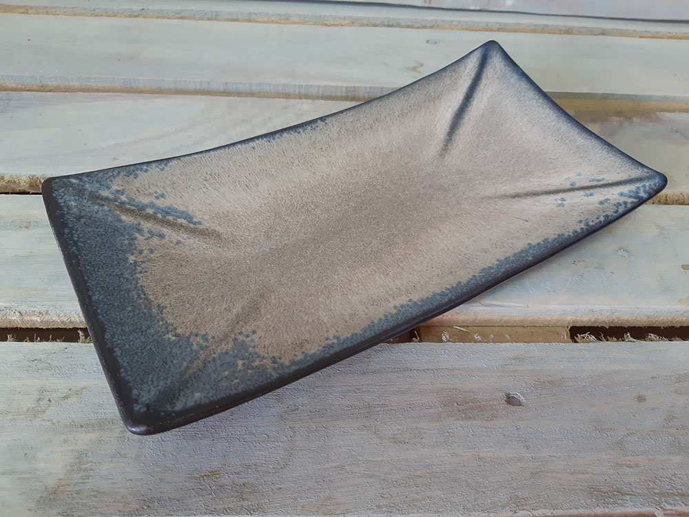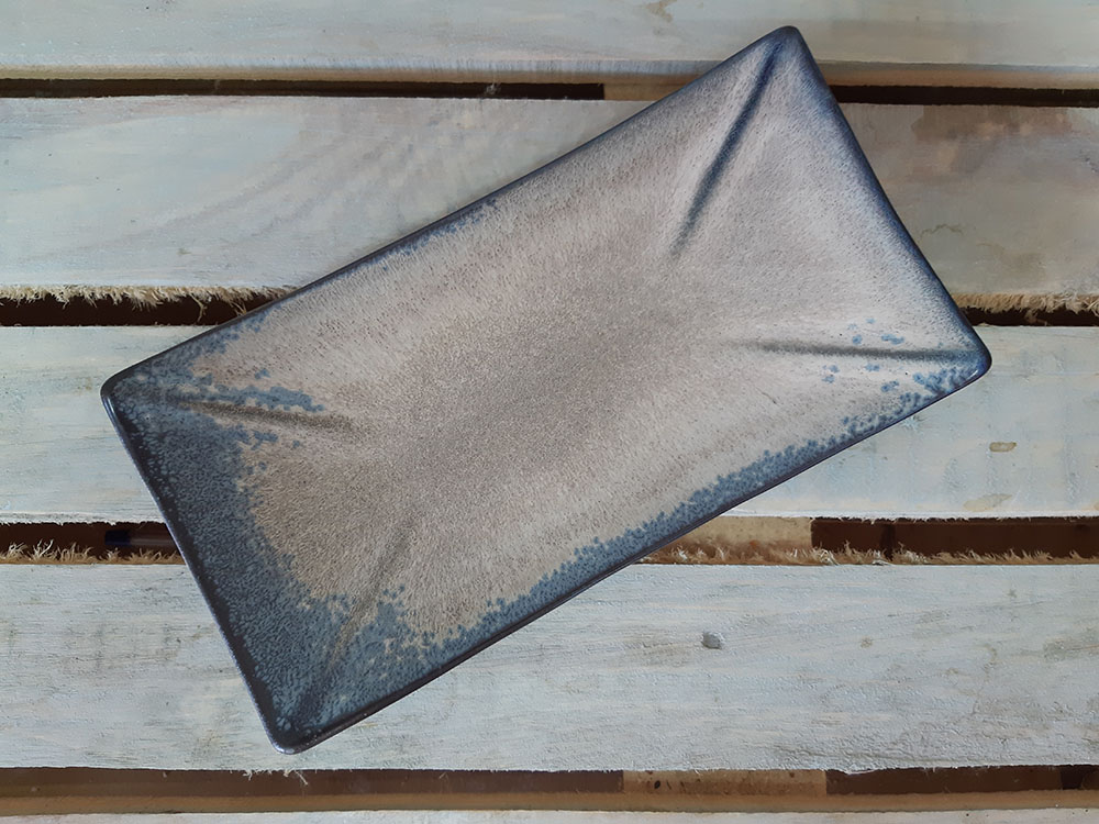 Фарфоровое блюдо для суши прямоугольной формы с приподнятыми краями. Очень практично в использовании и хранении, занимает мало места. Элегантный дизайн придает блюду утонченность и изысканность. Отличная идея для красивой подачи суши и роллов. Глянцевая поверхность с бежево-синими хаотичными переливами.