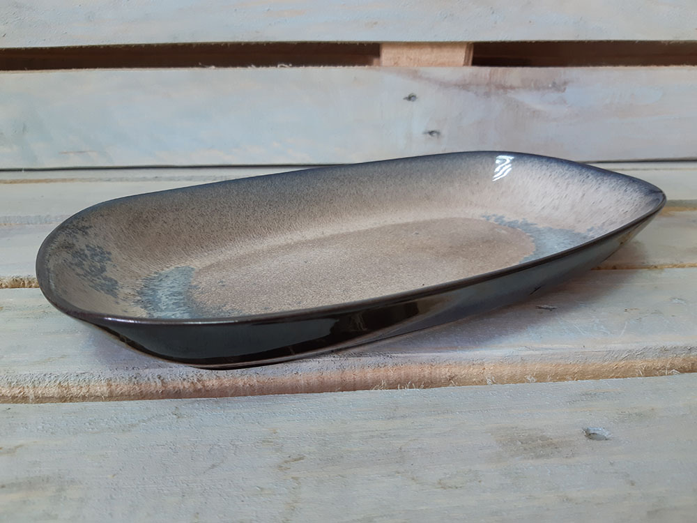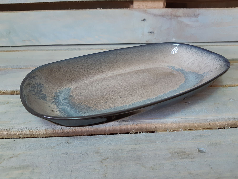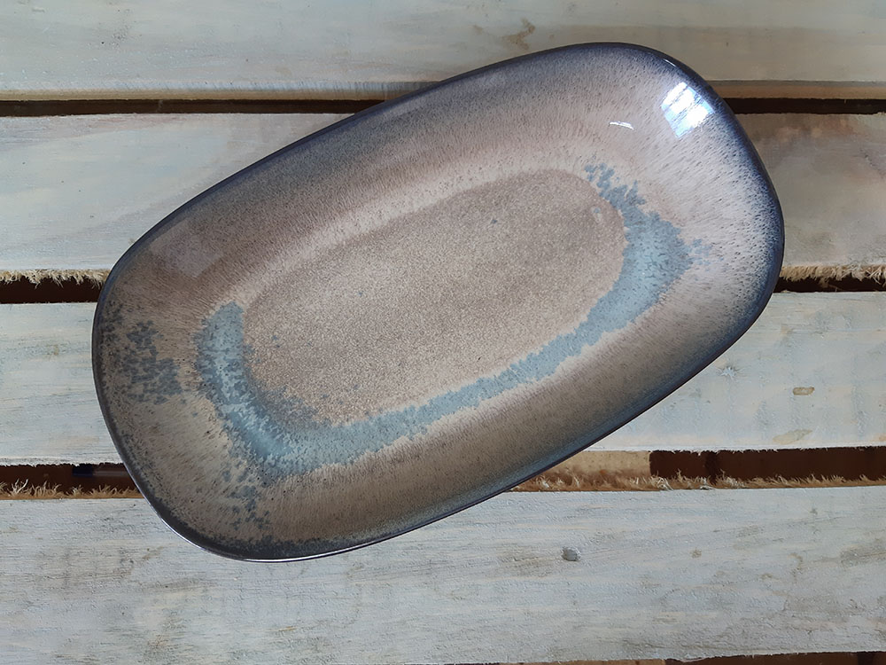 Большое блюдо moderno ovale имеет овально-прямоугольную форму с высокими бортиками. На таком блюде удобно подавать как холодные закуски, так и горячие угощения, накладывать салат, фрукты и даже сладости. Оригинальная подача в таком блюде гарантирована. Глянцевая поверхность с бежево-синими хаотичными переливами.
