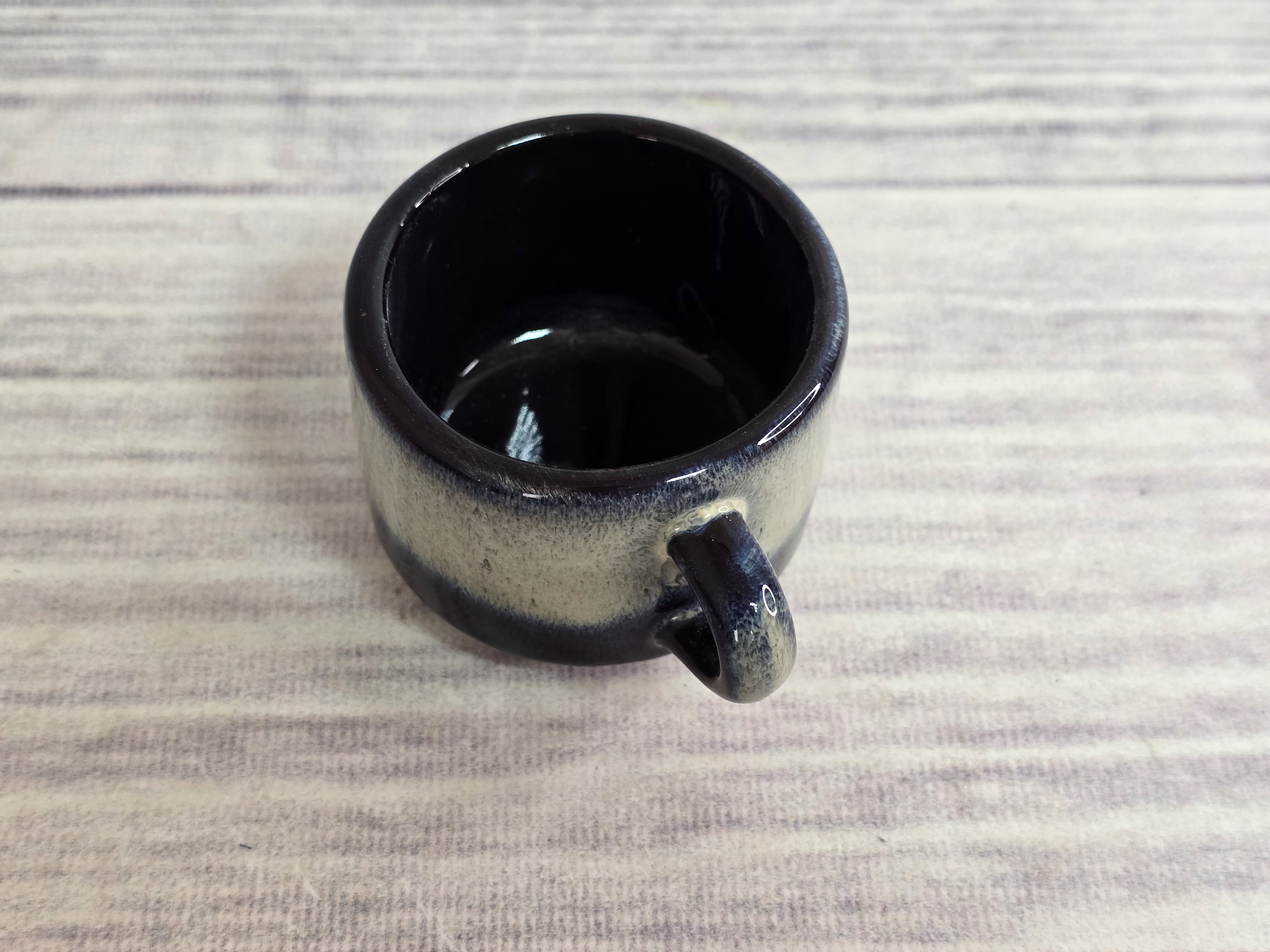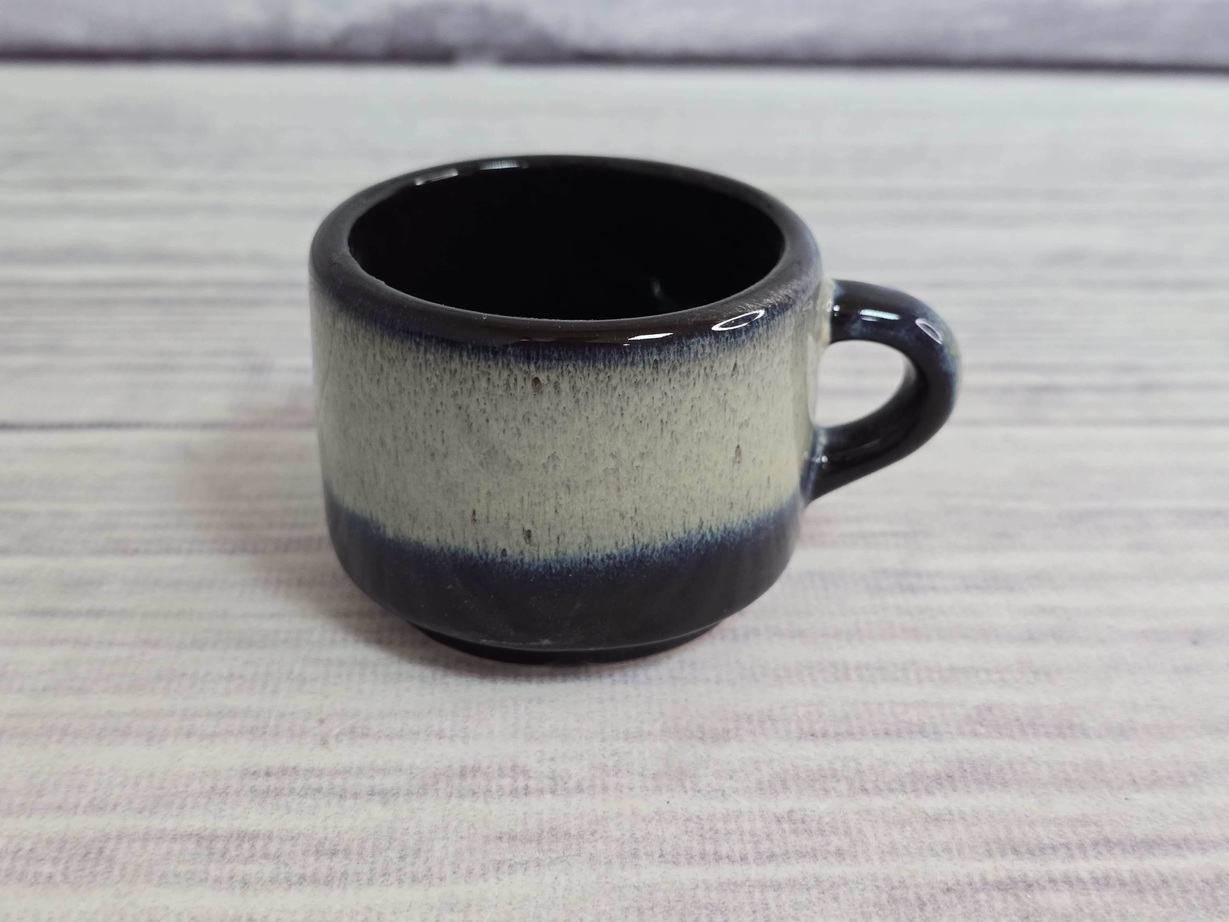 Оригинальная кофейная чашка. Идеально подходит для подачи кофе-эспрессо. Штабелируется, это значительно экономит место, друг на друга можно ставить свыше 10 шт. Чашка изготовлена из высокопрочного фарфора, пригодна для использования в посудомоечной машине и микроволной печи. Глянцевая поверхность с бежево-синими хаотичными переливами.