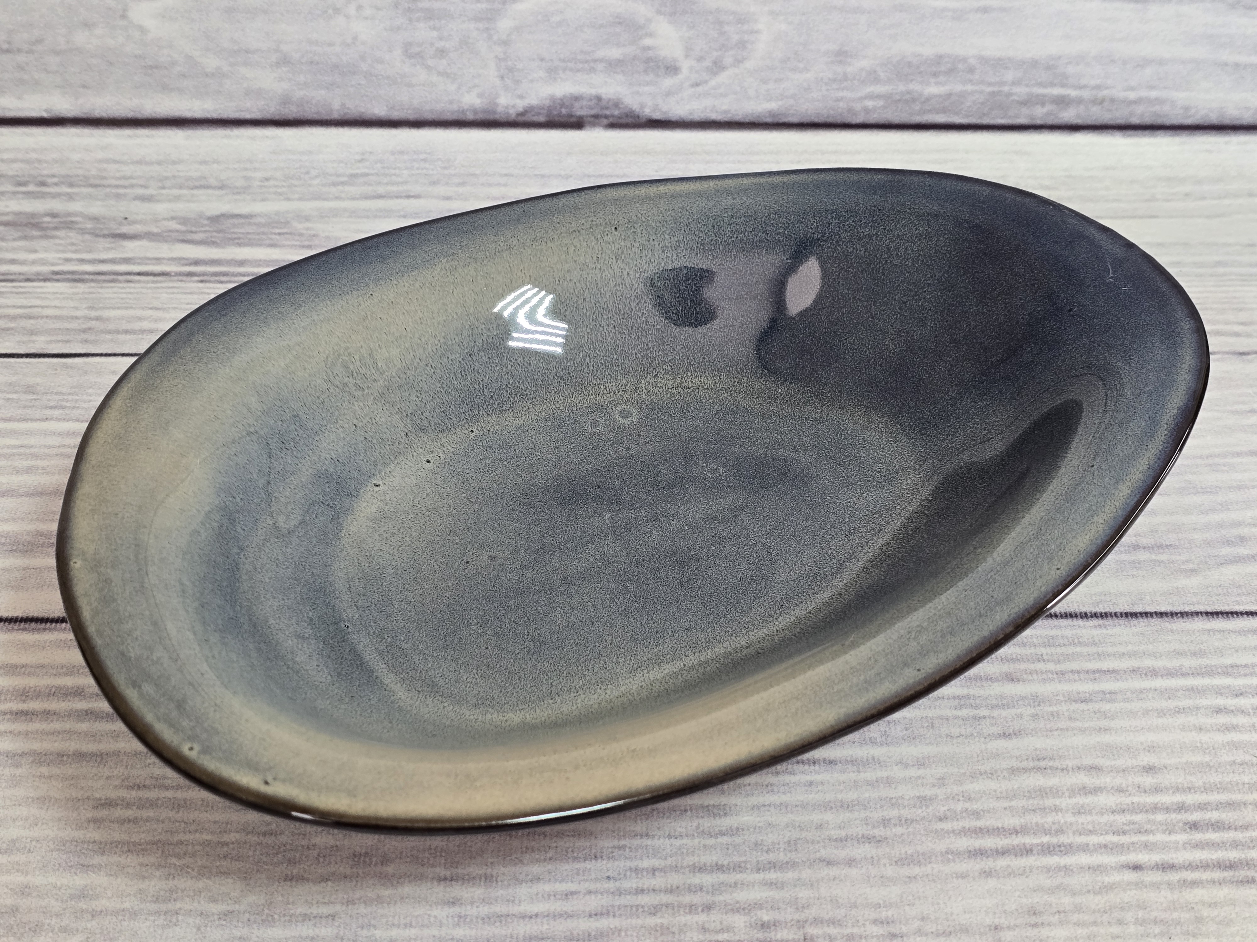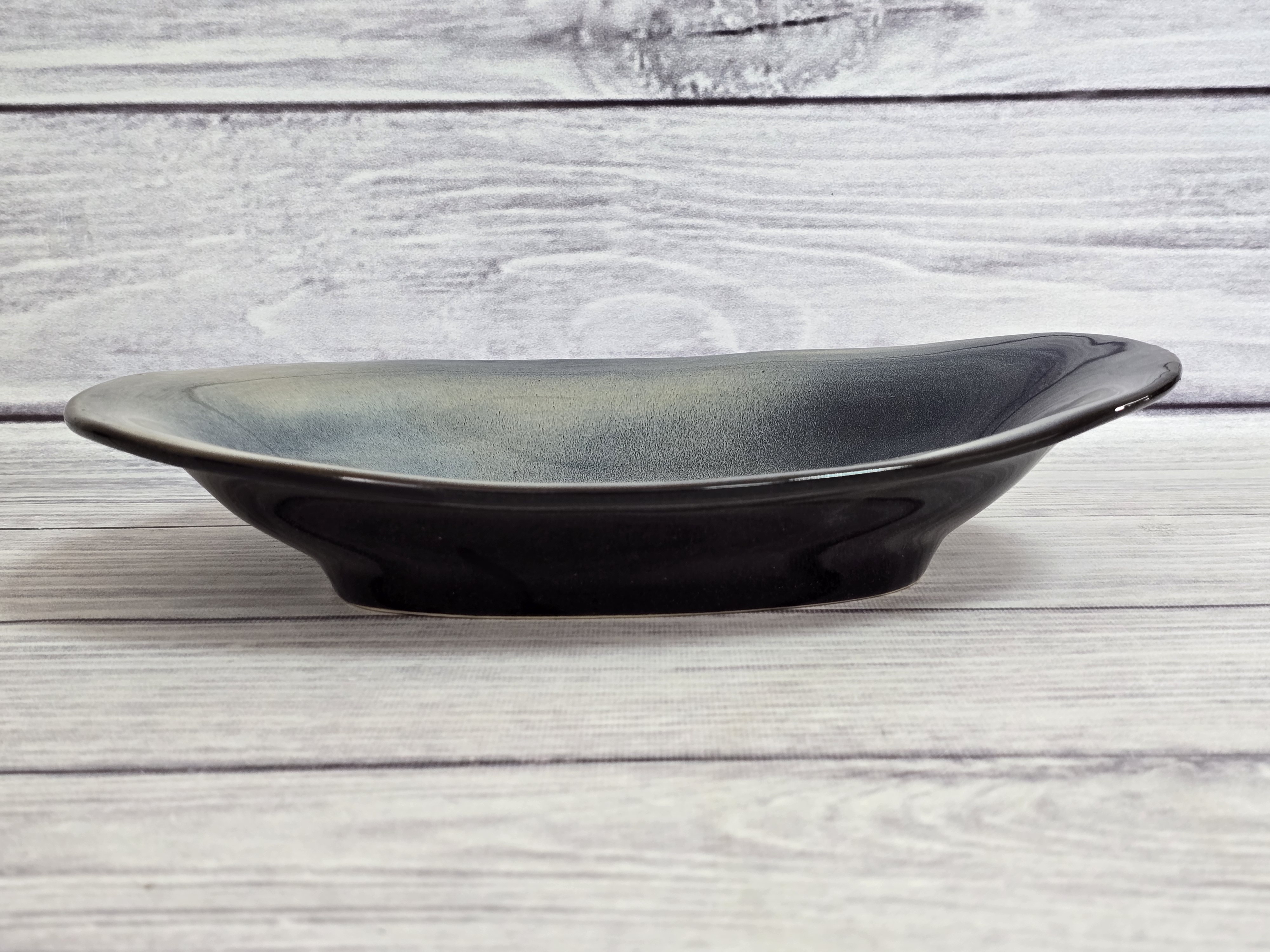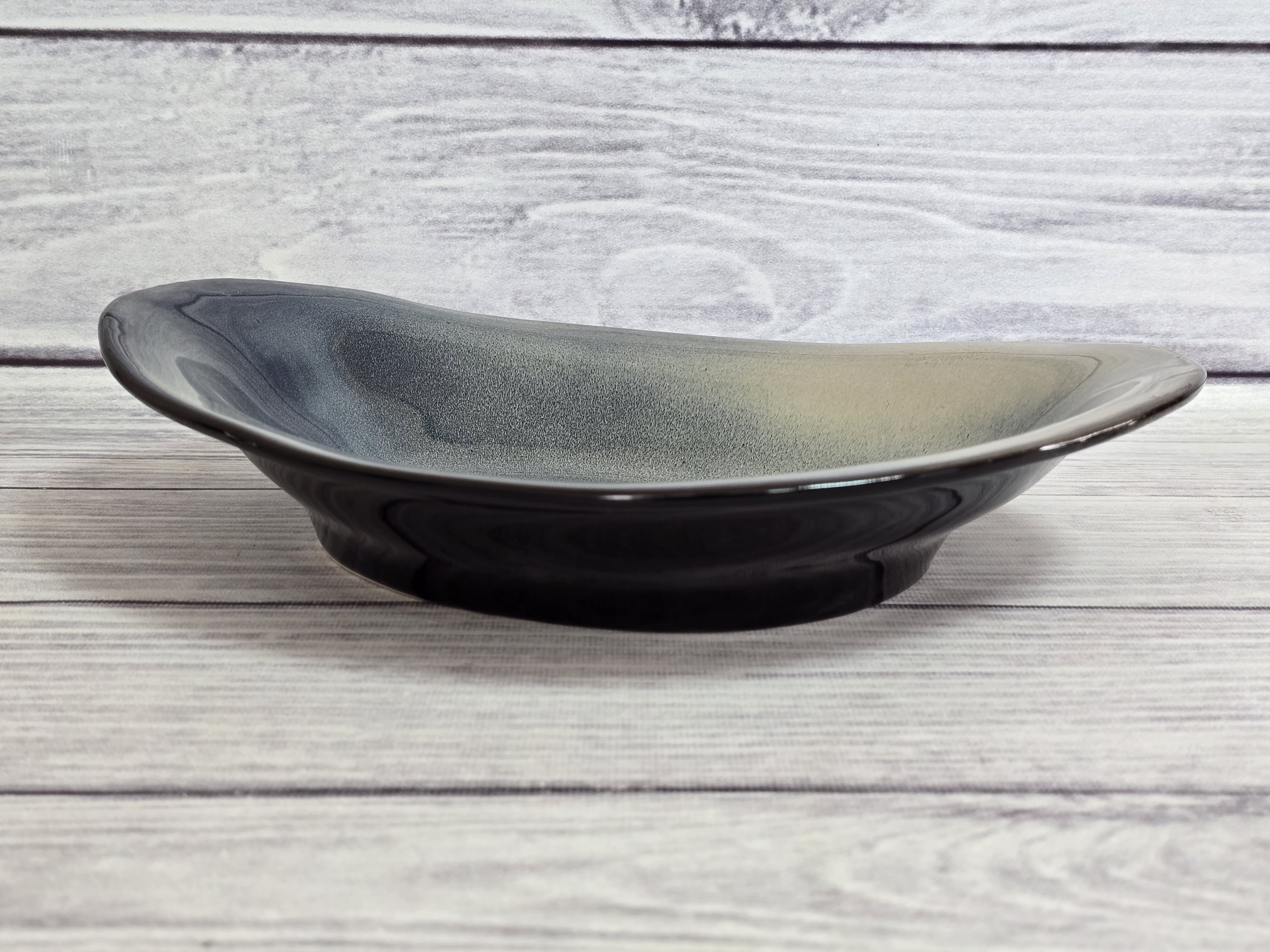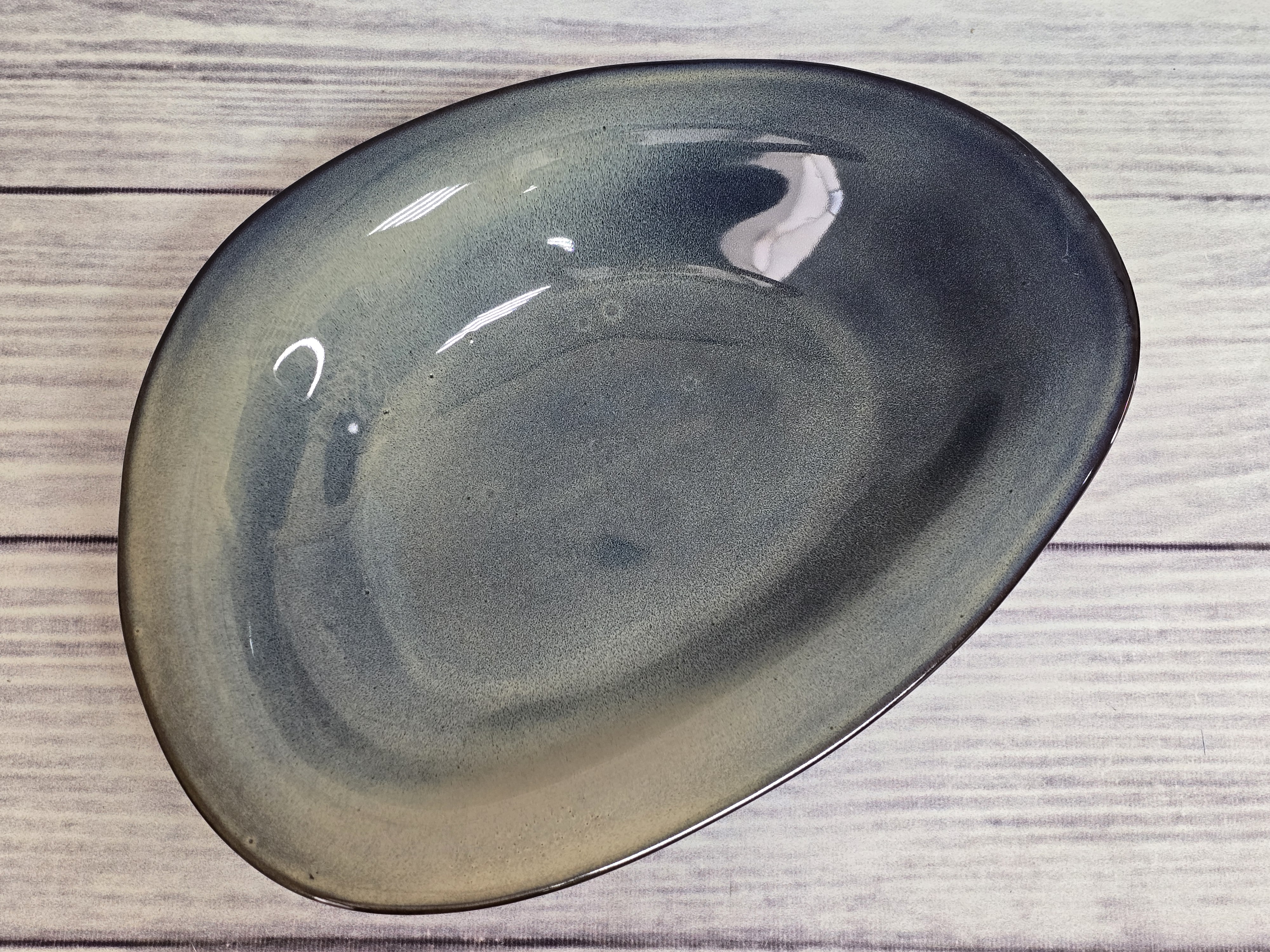 Тарелка неправильной формы. Грациозное и вместительное изделие будет настоящим украшением стола. Отличная идея для необычной подачи салатов или первых блюд. Является дополнением к тарелке barchetta. Тарелка пригодна для использования в микроволновой печи и посудомоечной машине. Глянцевая поверхность с бежево-синими хаотичными переливами.