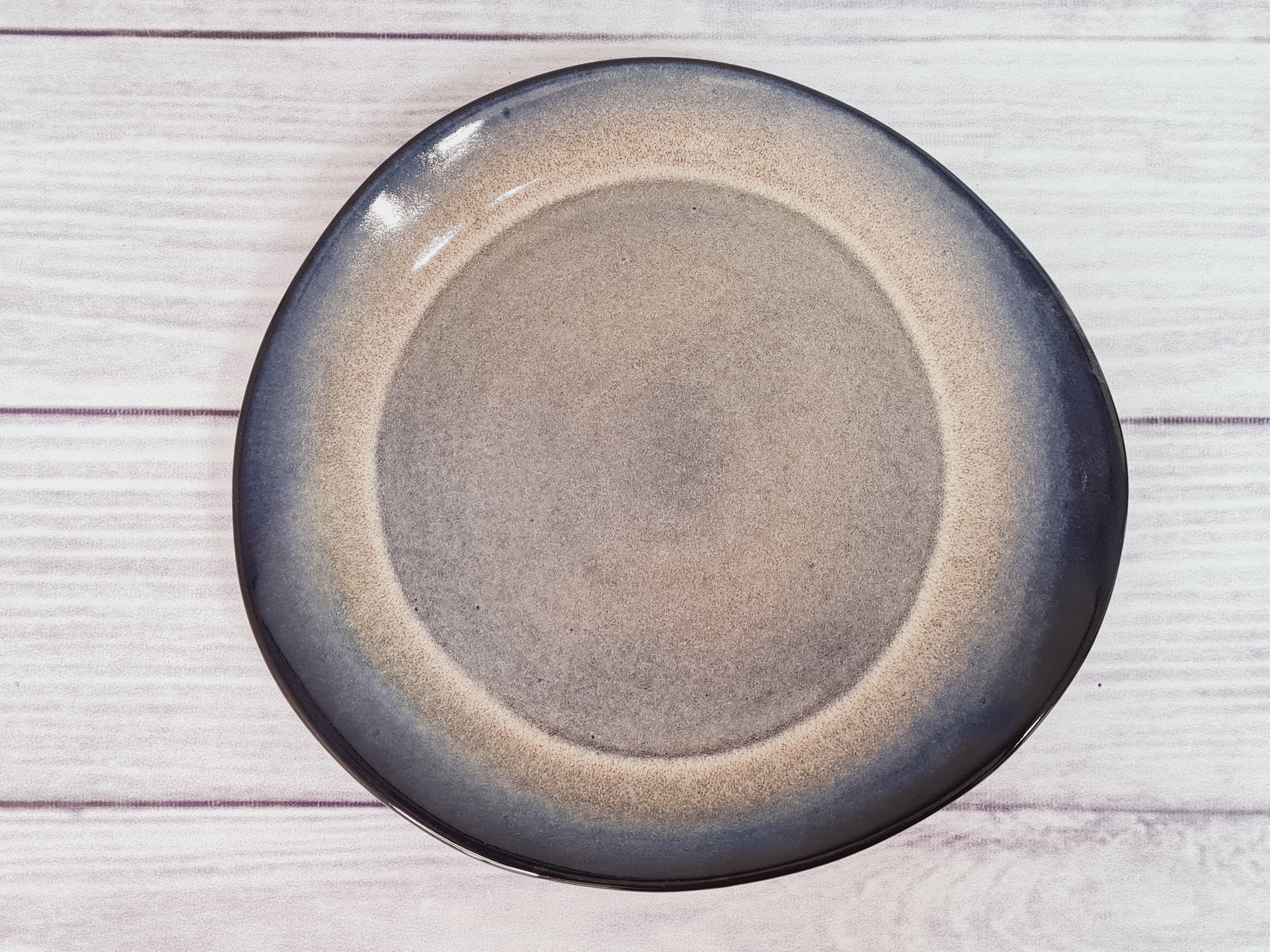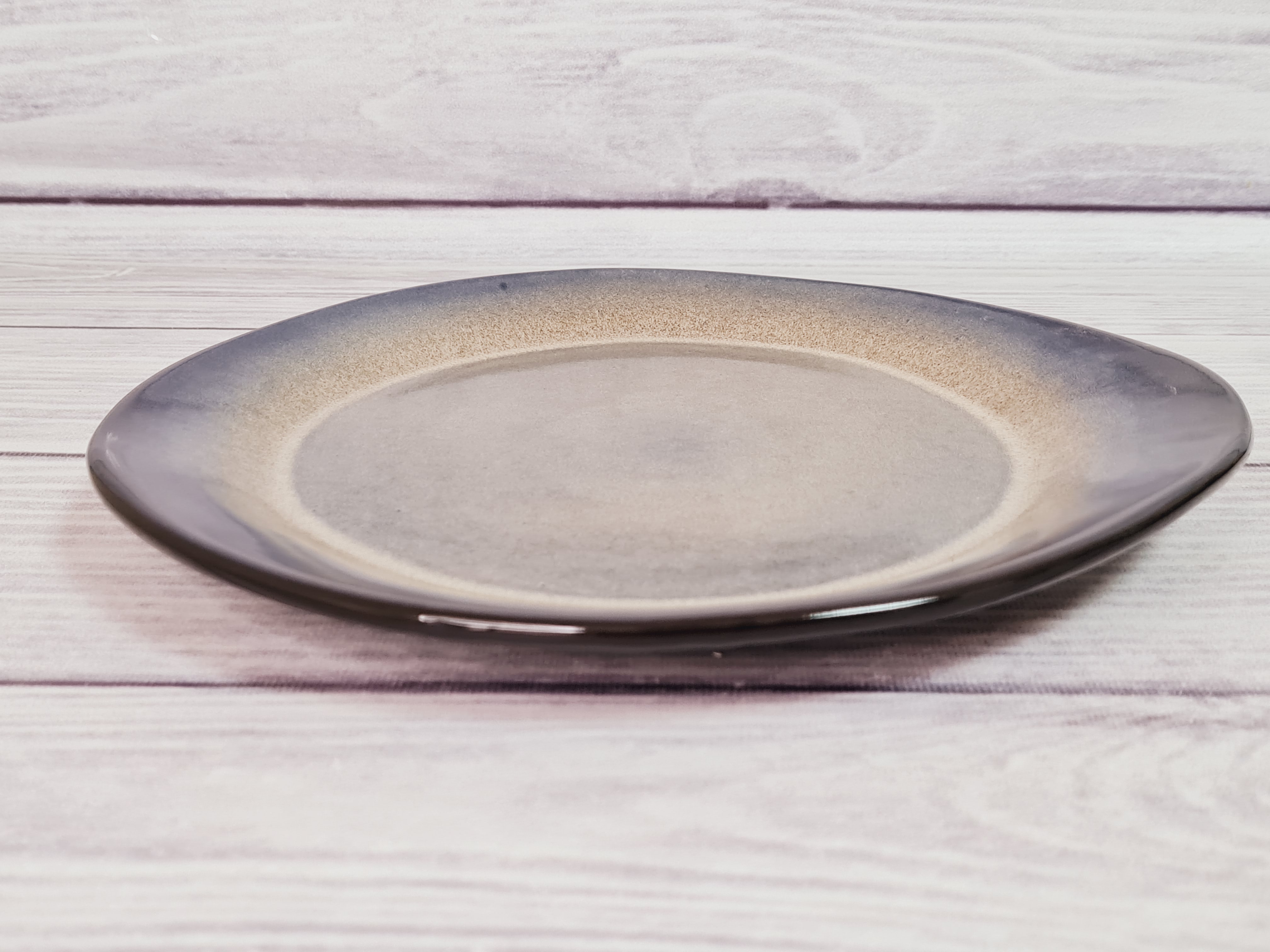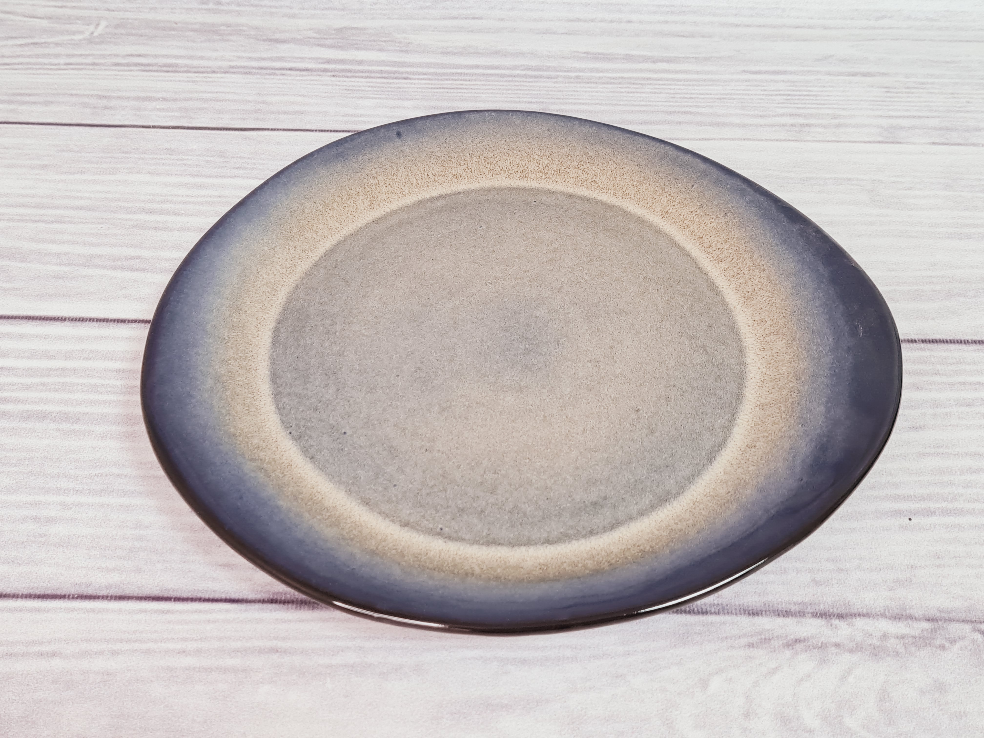 Тарелка маленького размера неправильной формы. Оригинальный дизайн позволяет сделать красивую выкладку блюда в соответствии с замыслом шеф-повара. Как говорится – ничего лишнего – поданное на такой тарелке блюдо будет выглядеть необычно и вкусно. Глянцевая поверхность с бежево-синими хаотичными переливами.
